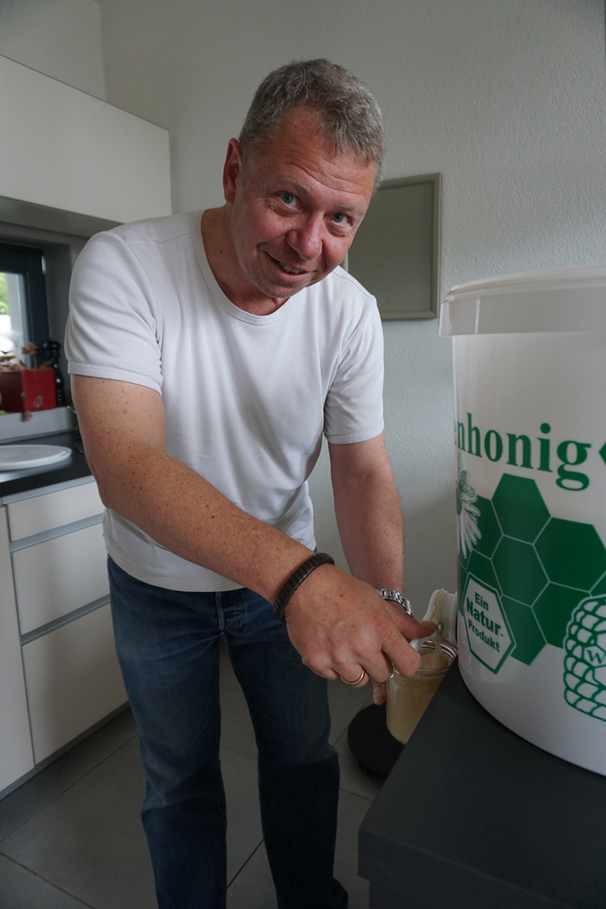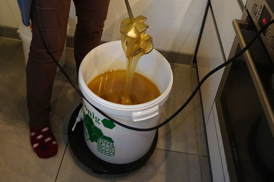 Jetzt ist der Honig schon deutlich heller geworden. In wenigen Tagen kann der typisch hellcremige Rapshonig abgefüllt werden.