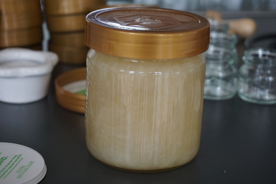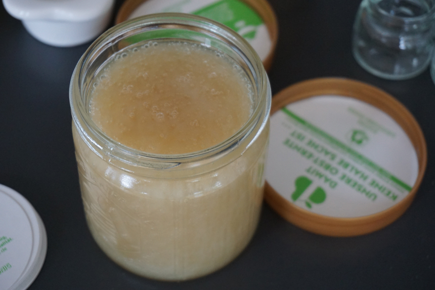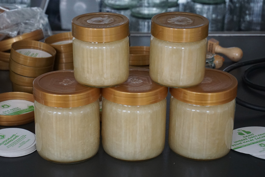 Der fertige Honig im Glas steht noch ein bisschen bis die Blasen weg sind ...
